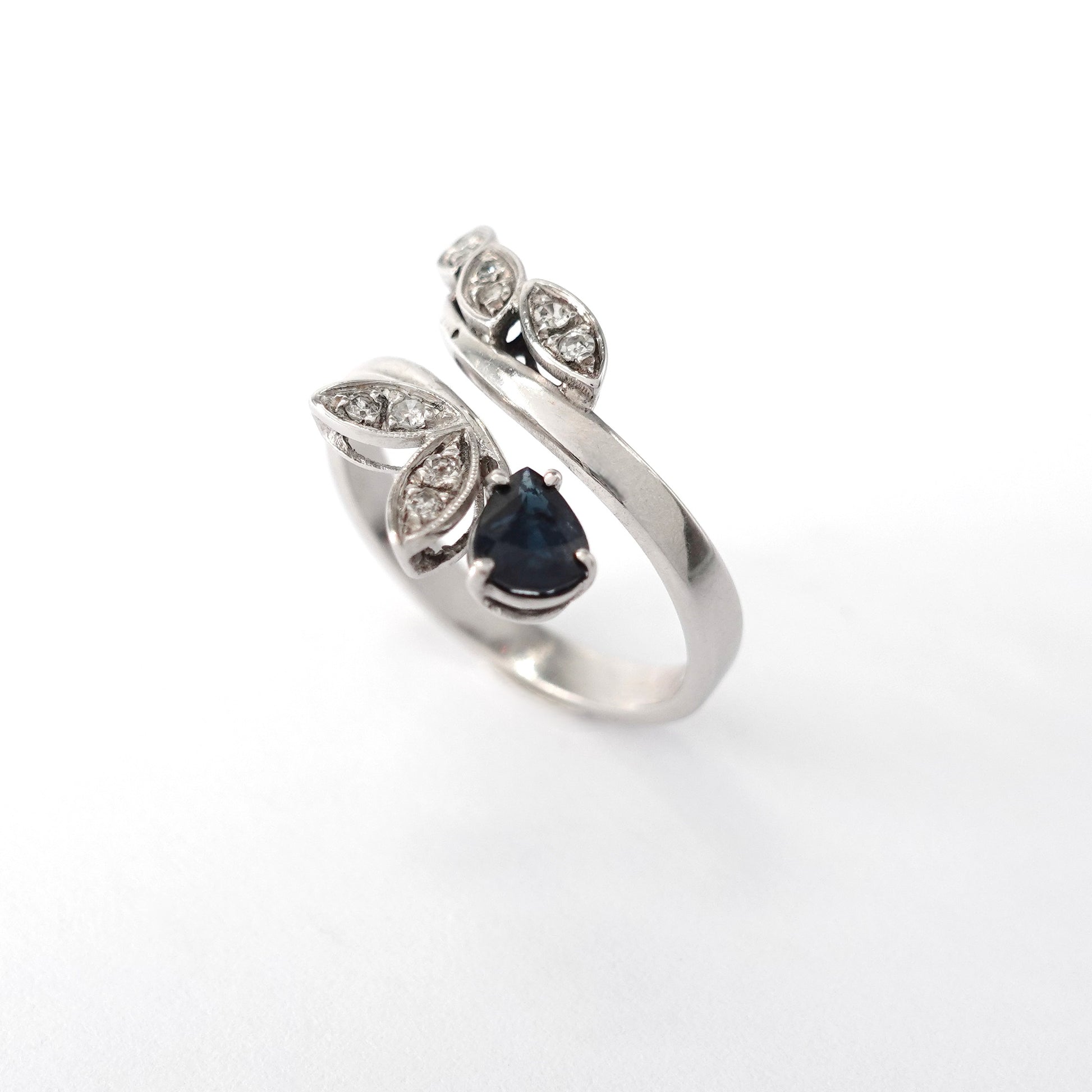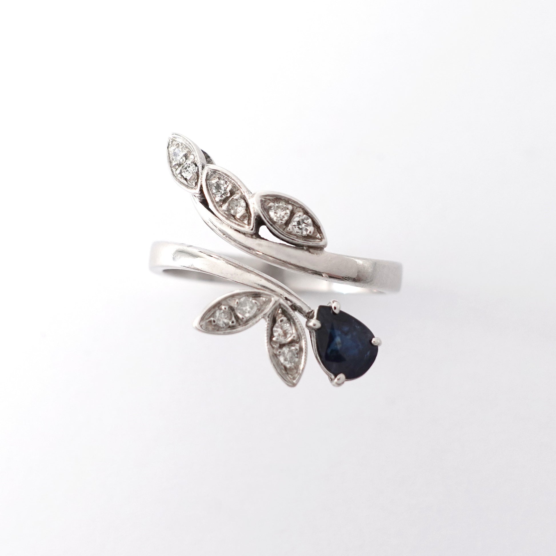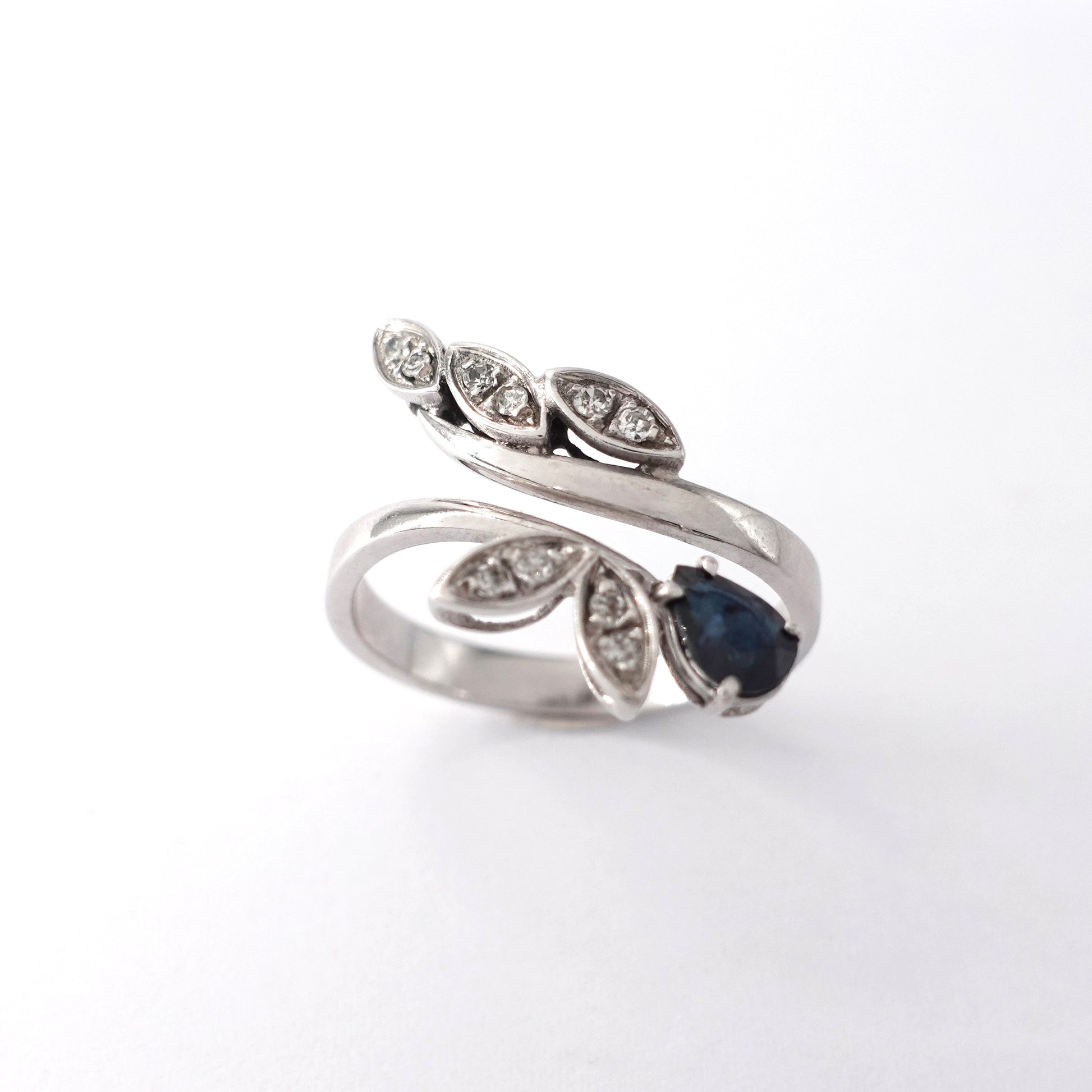 Anello contrariè con foglie in oro bianco 18kt e zirconi.