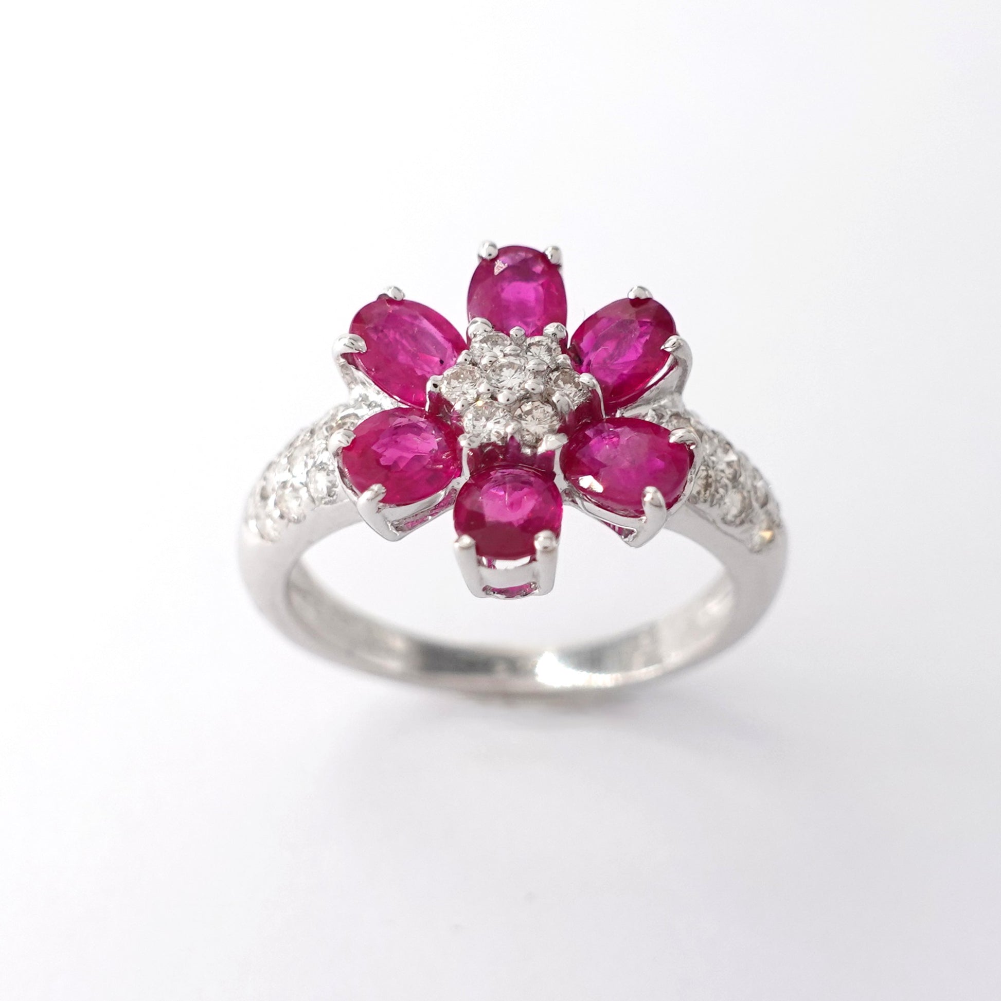 Anello in oro bianco 18kt a fiore con rubini (1,88ct) e diamanti taglio brillante (0,47ct.)