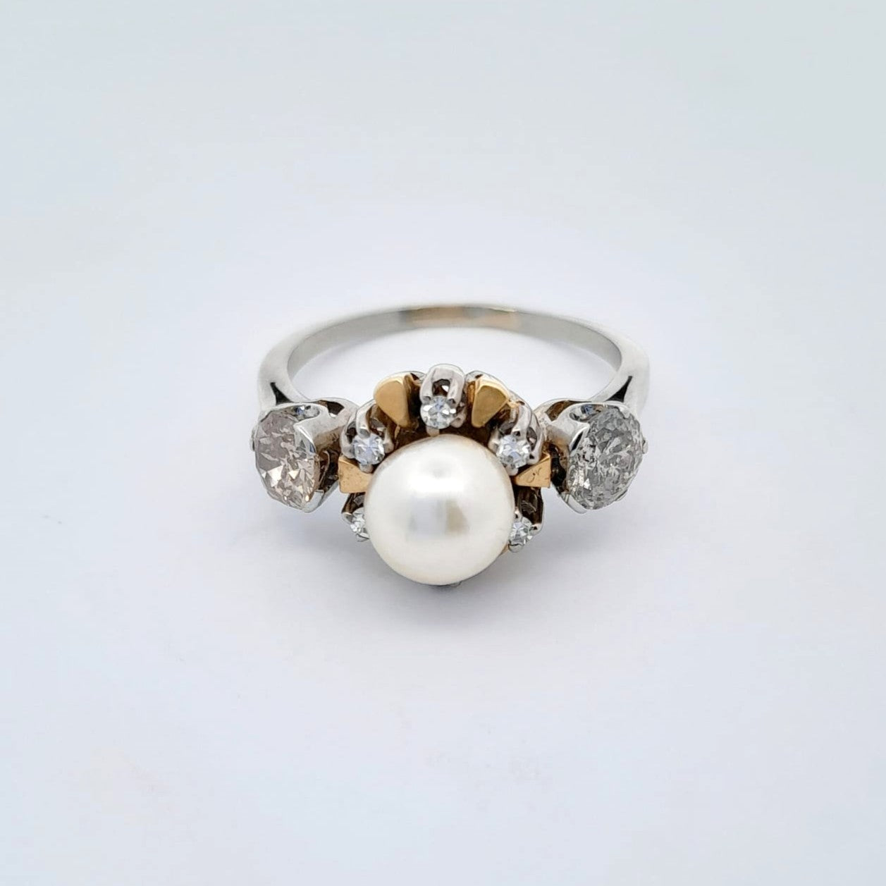 Anello in oro bianco e giallo 18kt con perla e diamanti