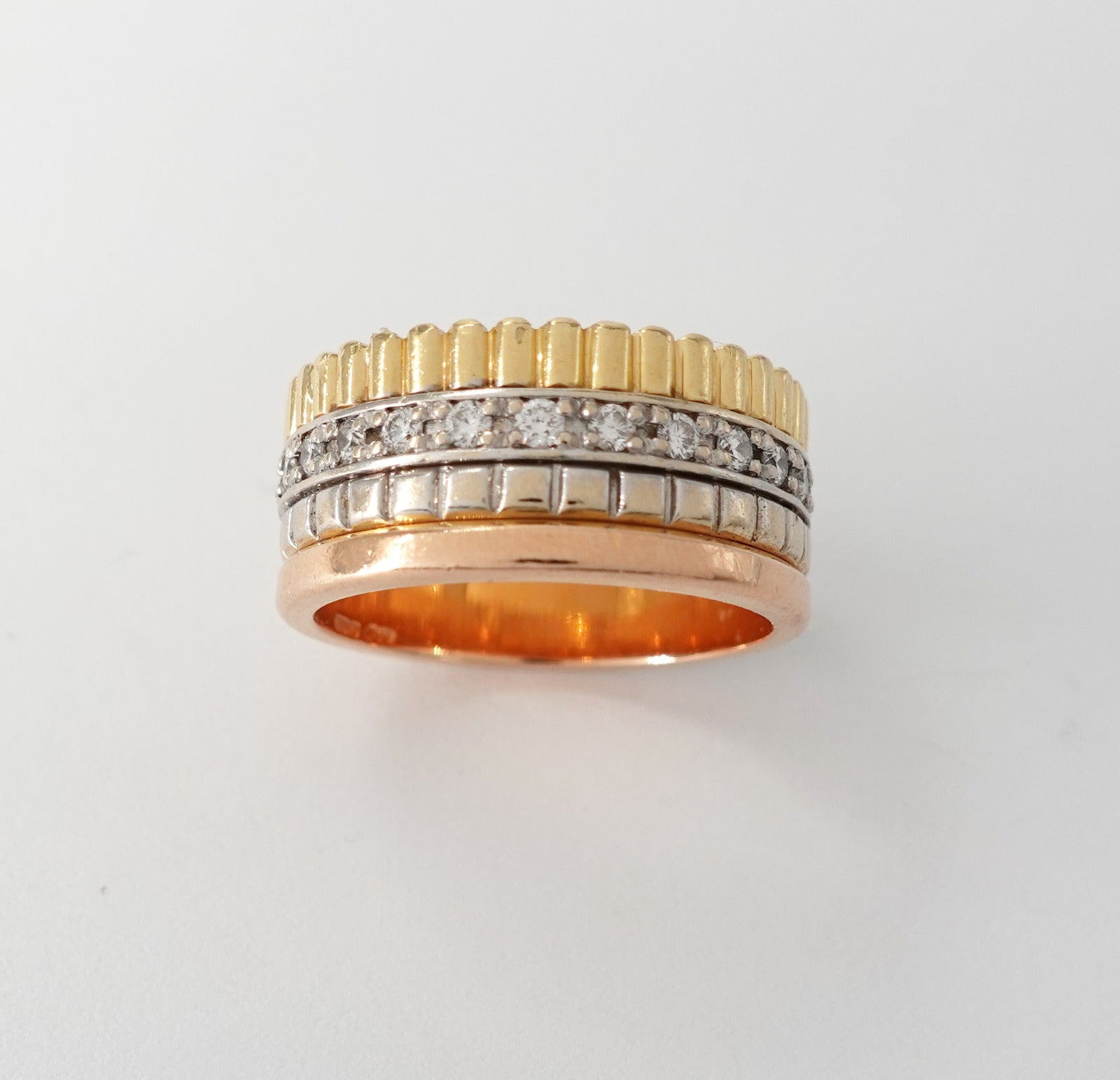 Anello a fascia lavorata in oro giallo, bianco e rosè 18kt con eternity di diamanti taglio brillante