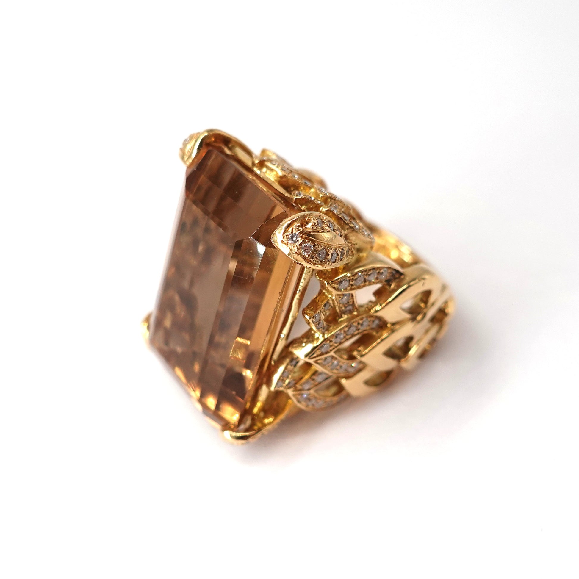 Anello in oro giallo 18kt con fiamme di diamante taglio brillante sui lati e grosso topazio fumé centrale.