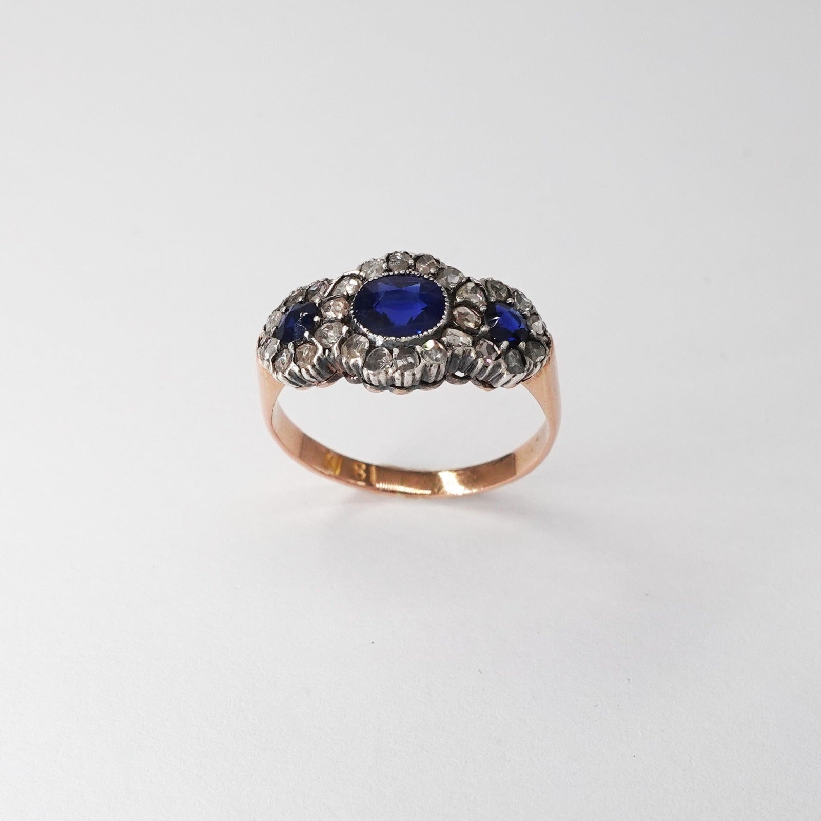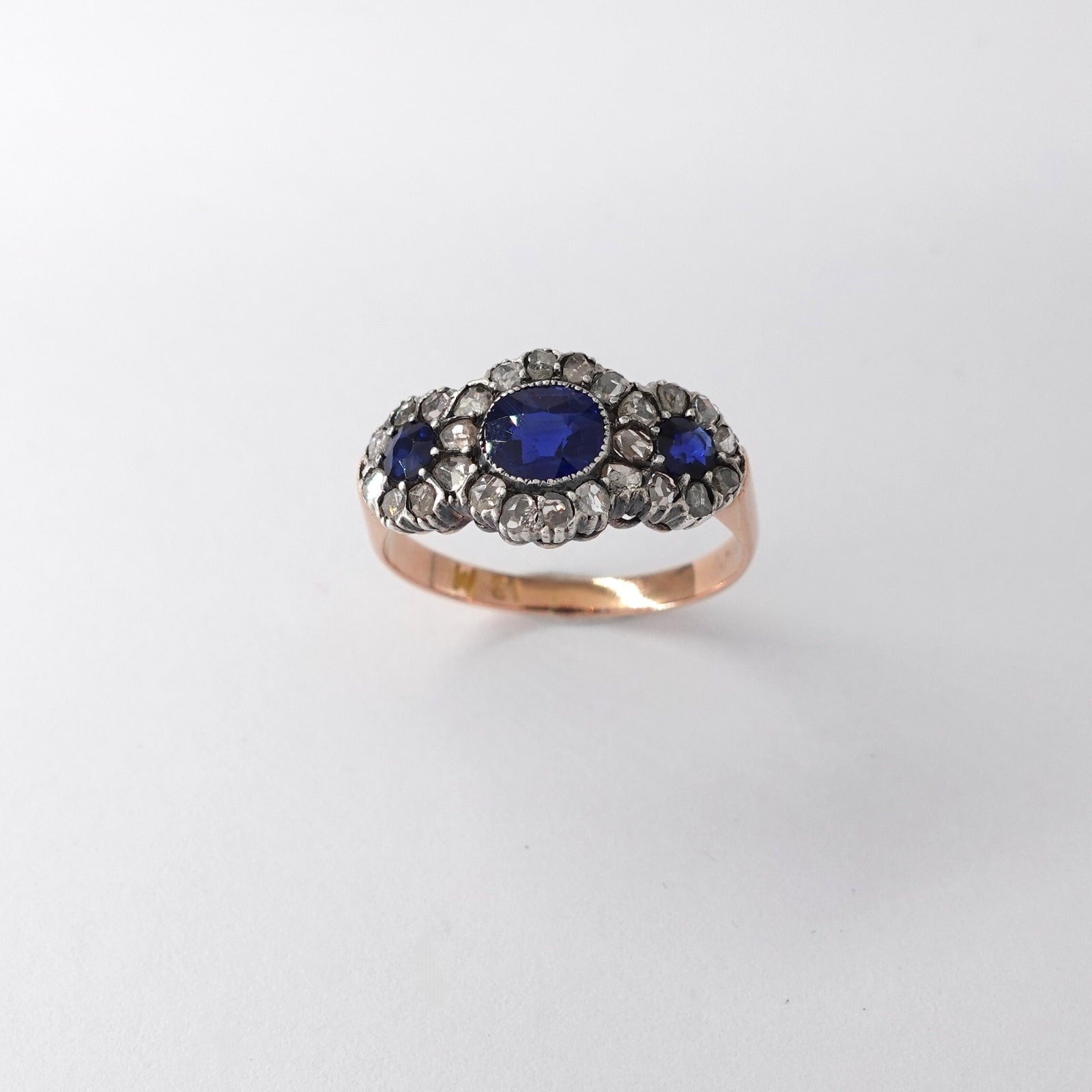 Anello vintage in oro rosè 18kt e argento925 con diamanti taglio antico e zaffiri