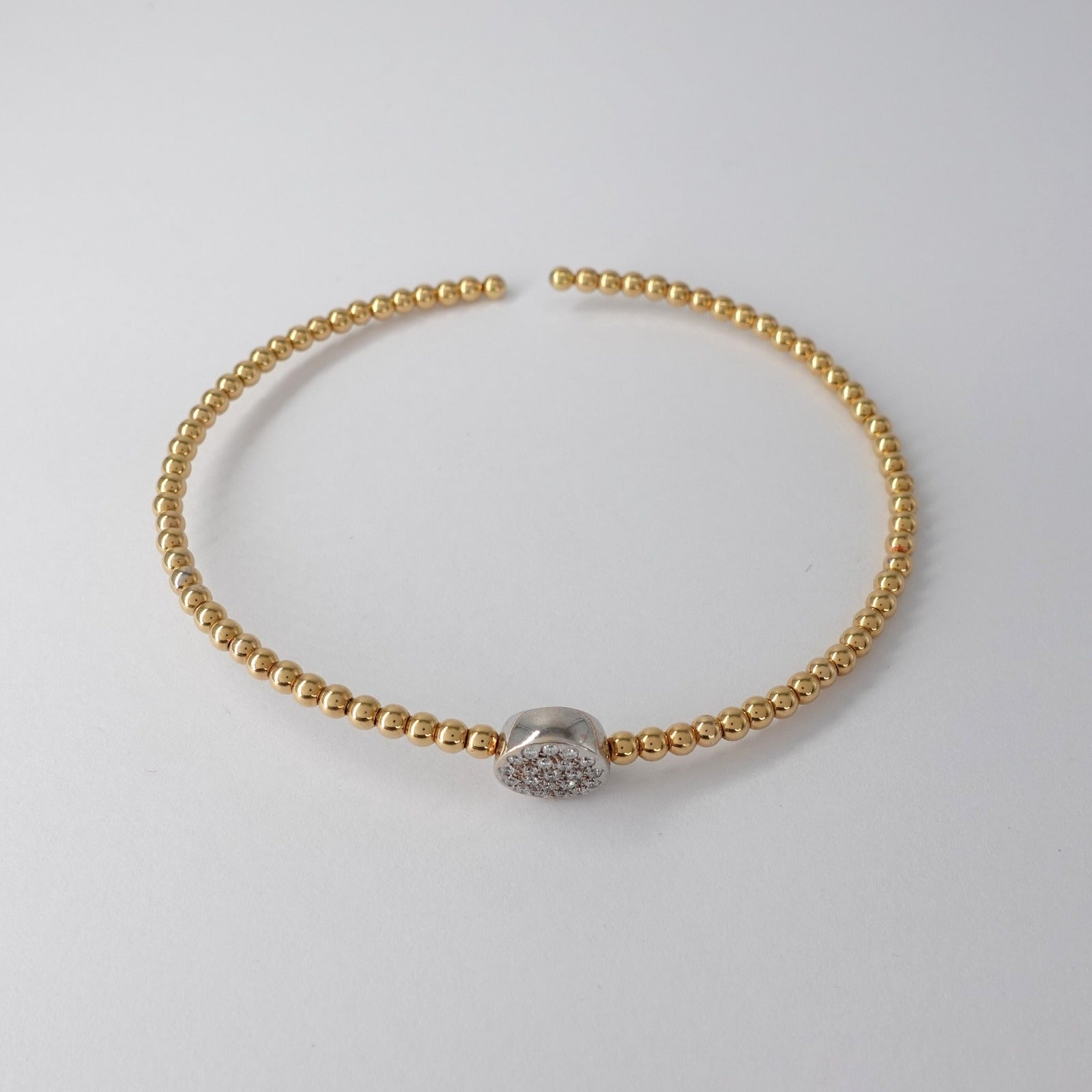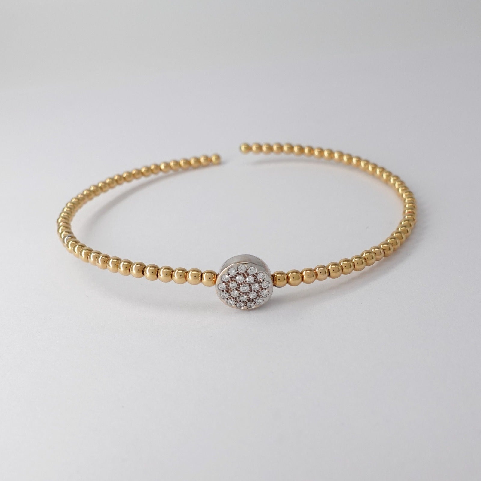 Bracciale rigido in oro giallo e bianco 18kt con maglia a pallini e pavè di diamanti taglio brillante