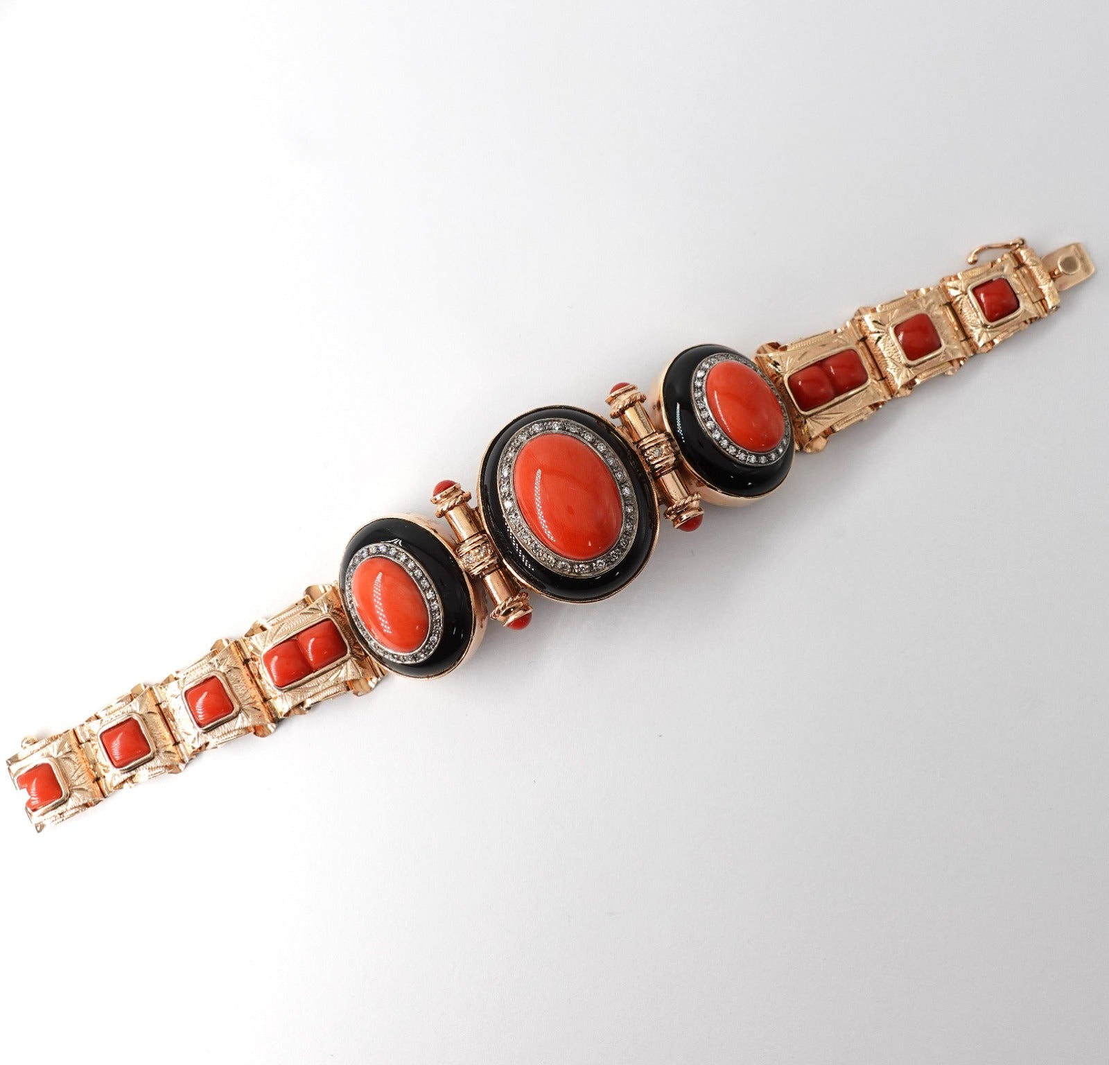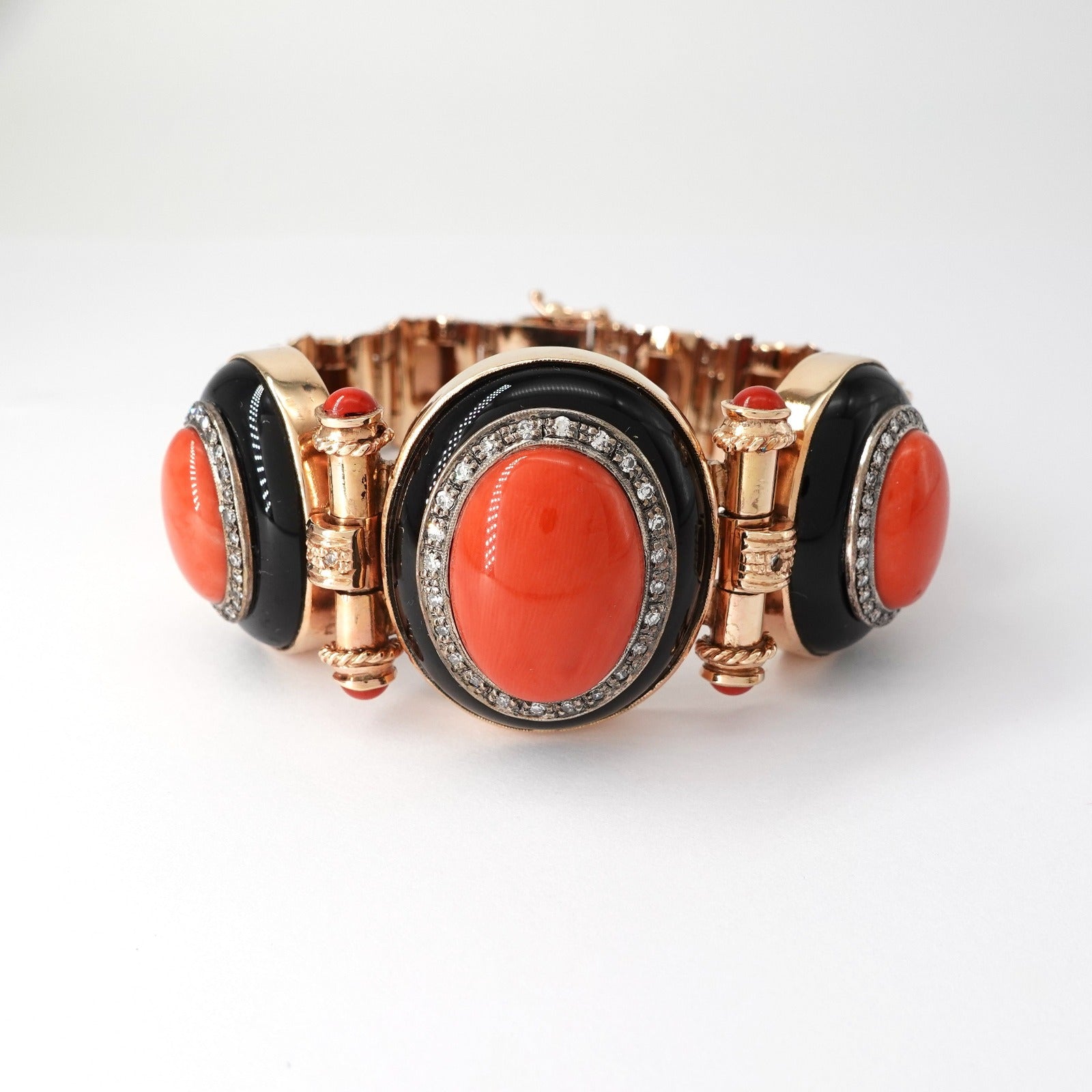 Bracciale vintage con corallo, onice e brillanti in oro 9kt.