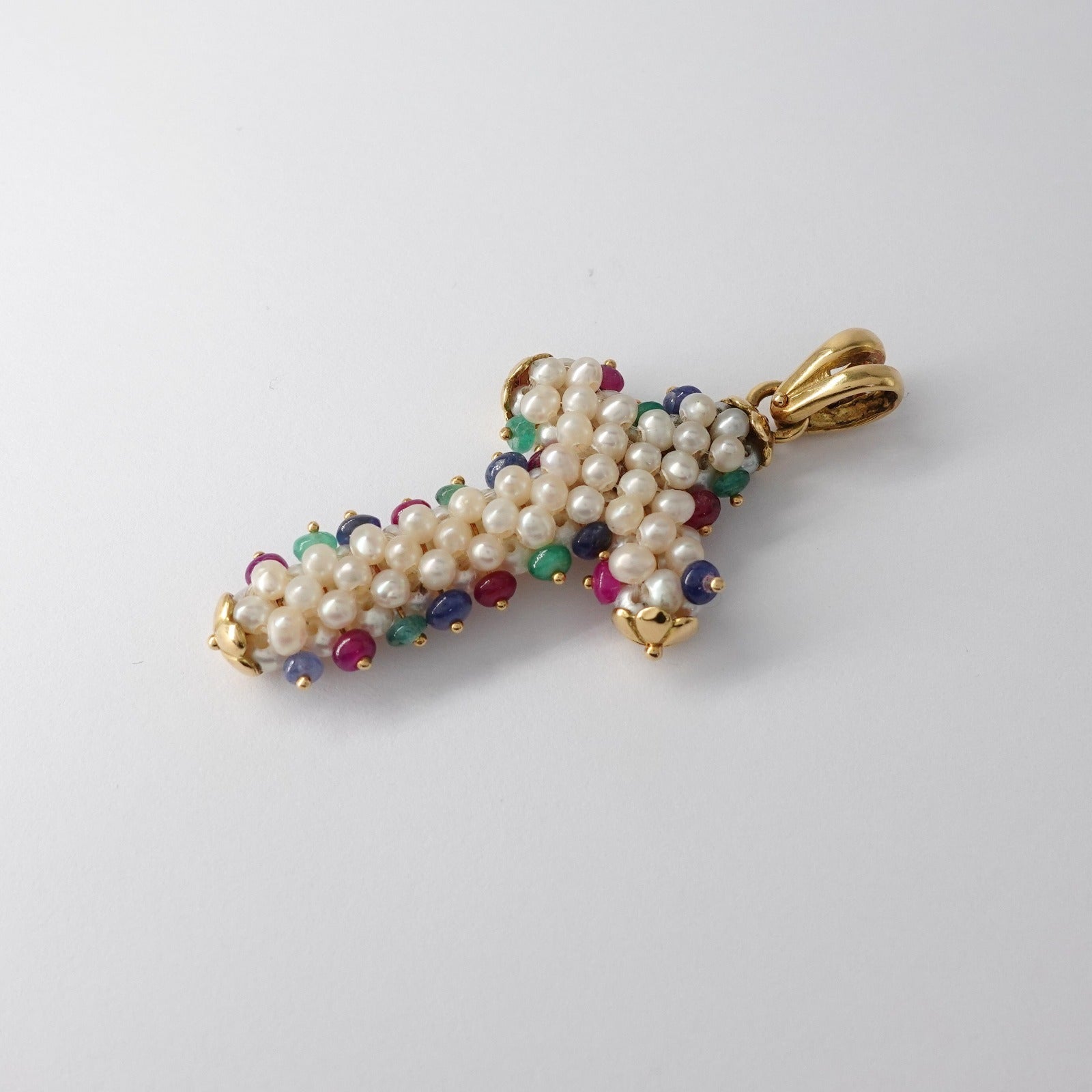 Ciondolo croce in oro giallo 18kt con perle e gemme