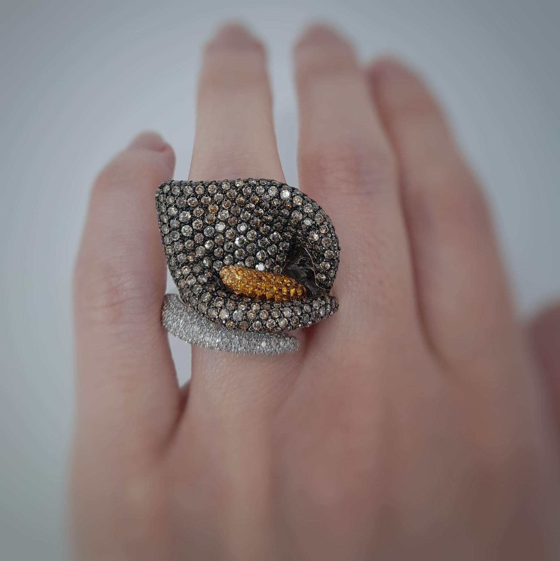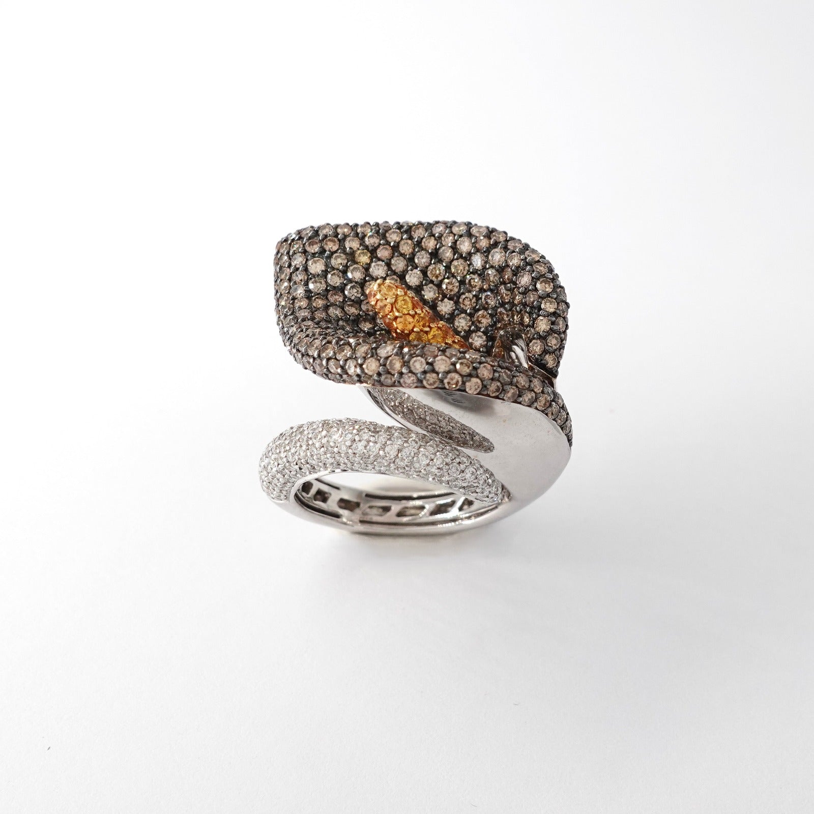 Anello calla CRIVELLI in oro bianco 18kt con pavè di diamanti, diamanti brown e diamanti fancy Peso: 24,58gr Misura: 12 Cod.1323B