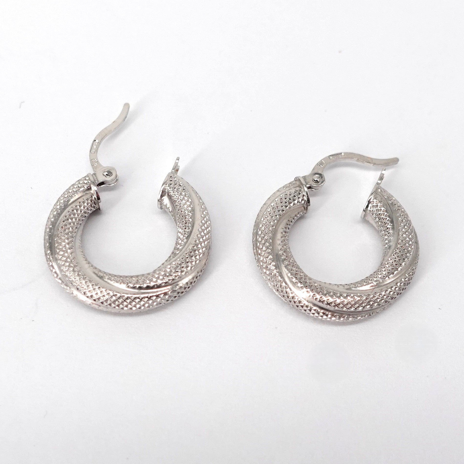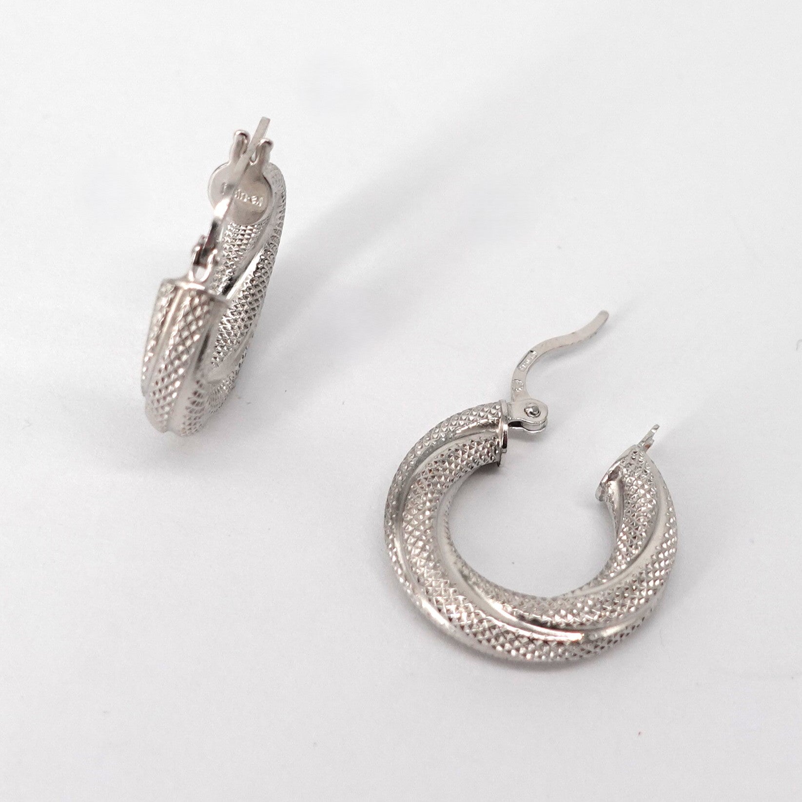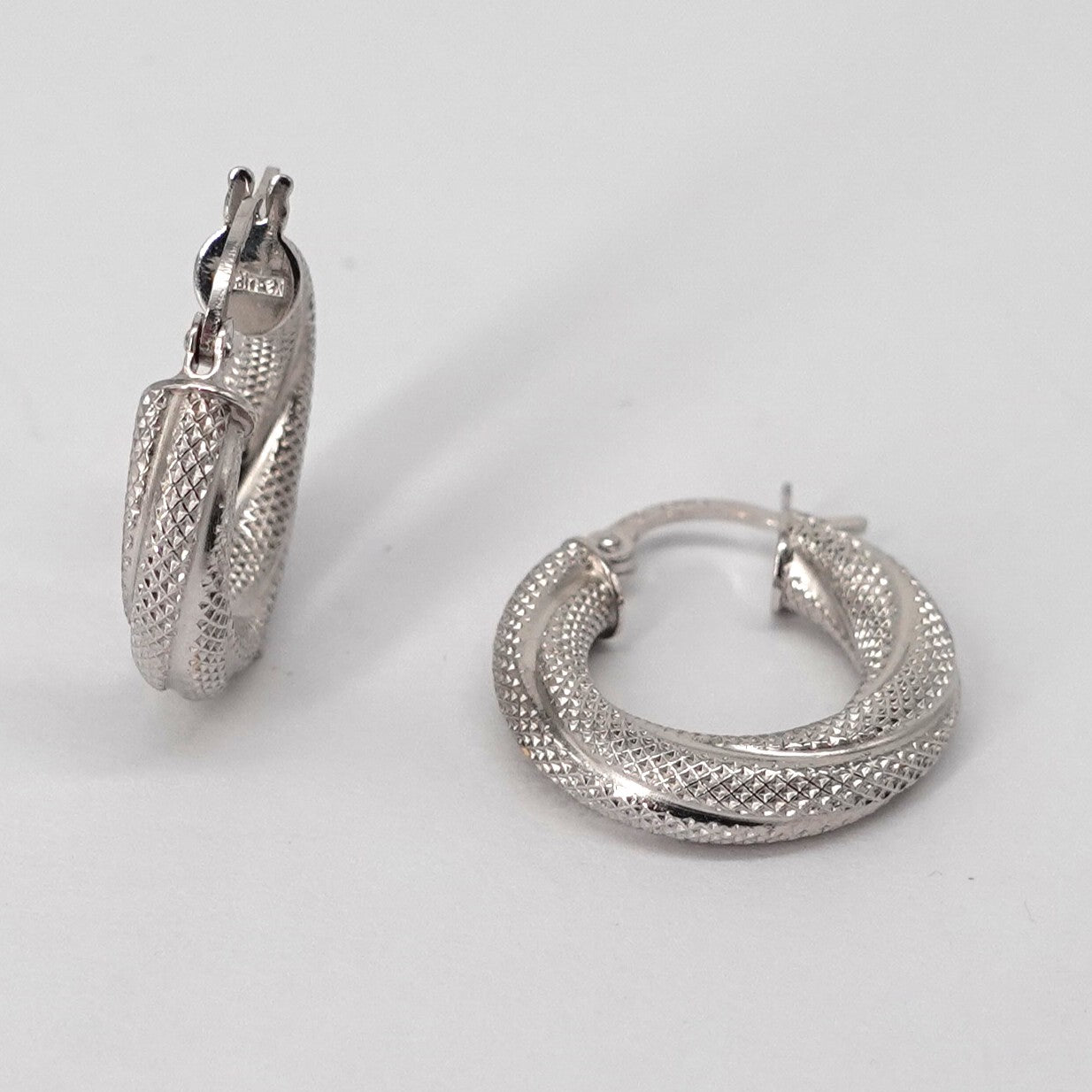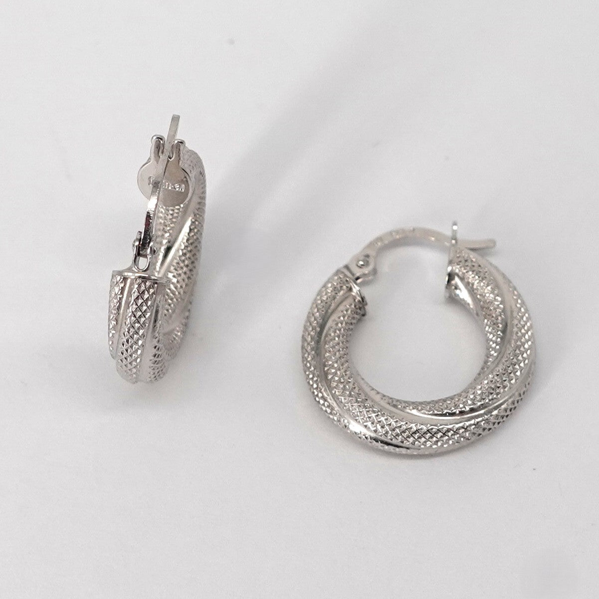 Orecchini a cerchio in oro bianco 18kt, lavorati.