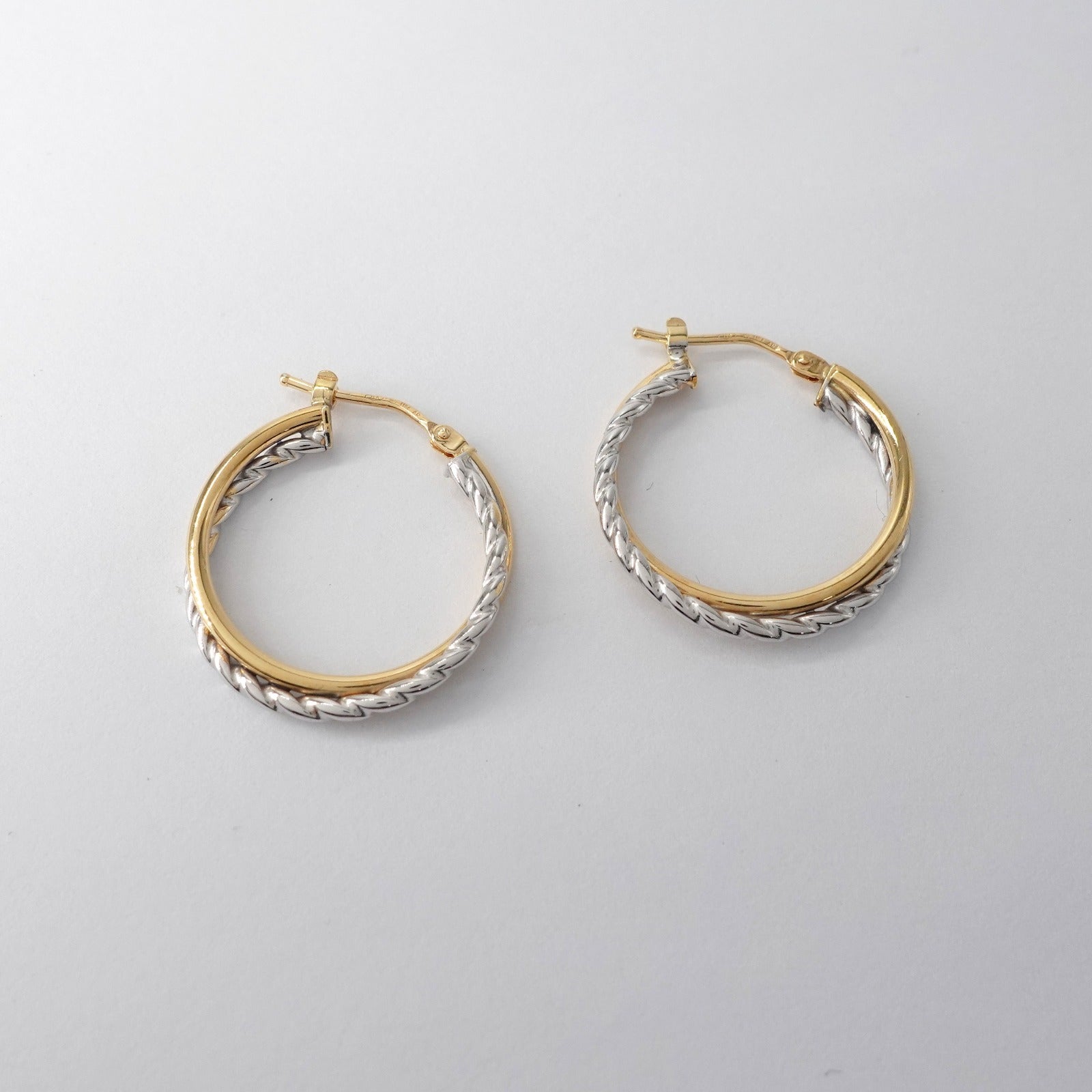 Orecchini a cerchio, lavorati,  in oro giallo e bianco 18kt
