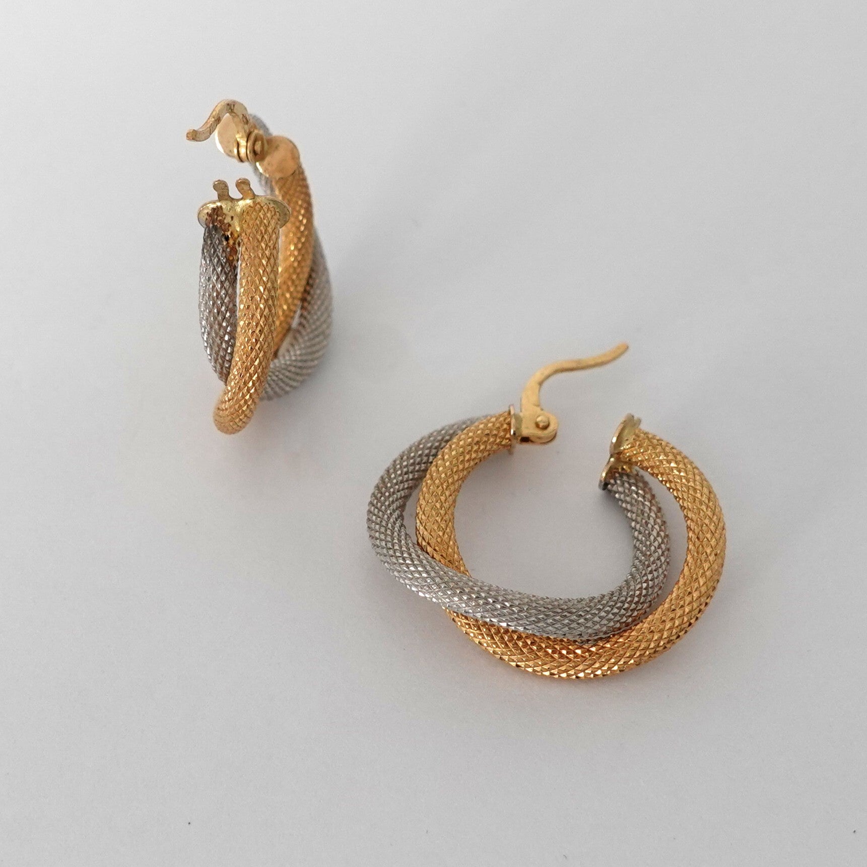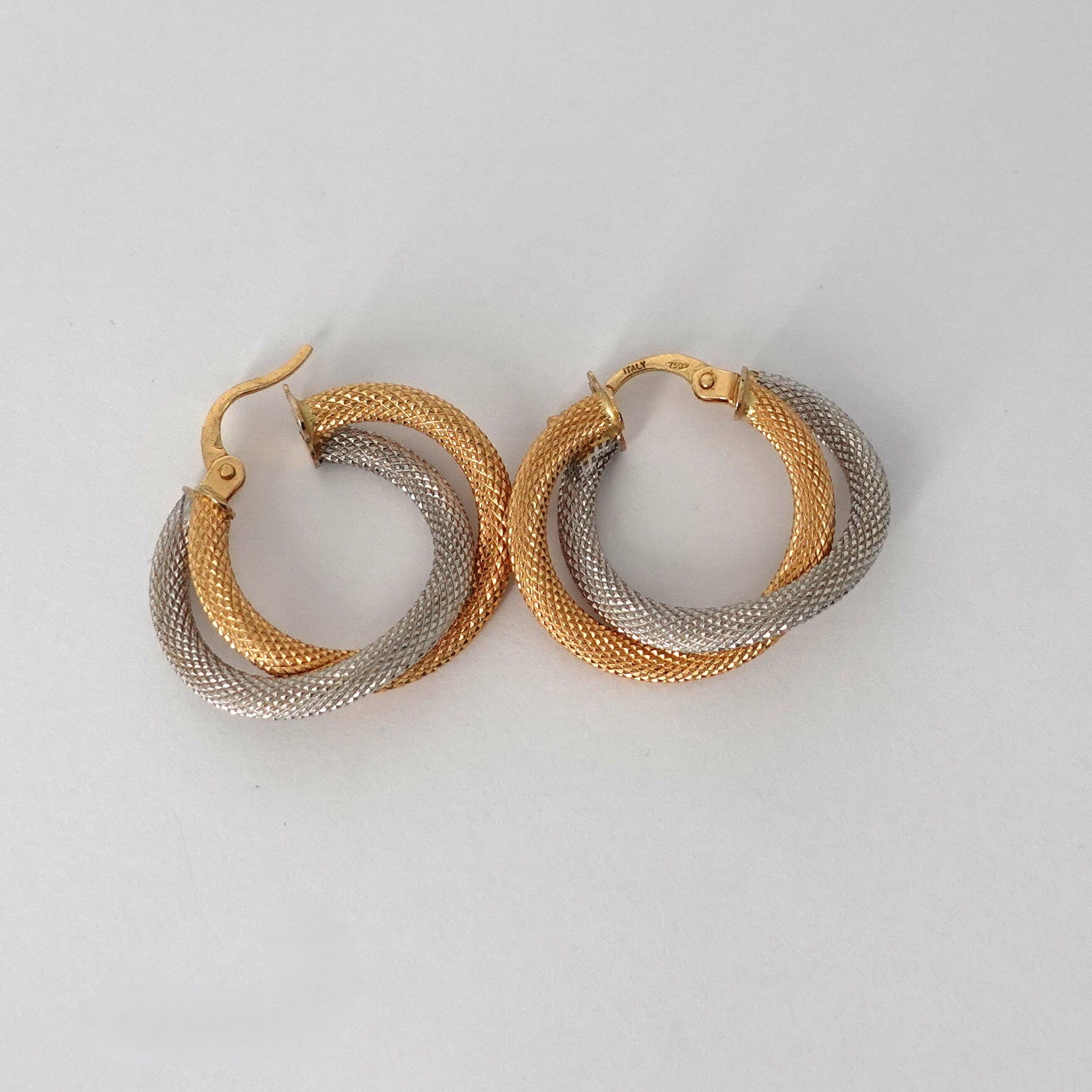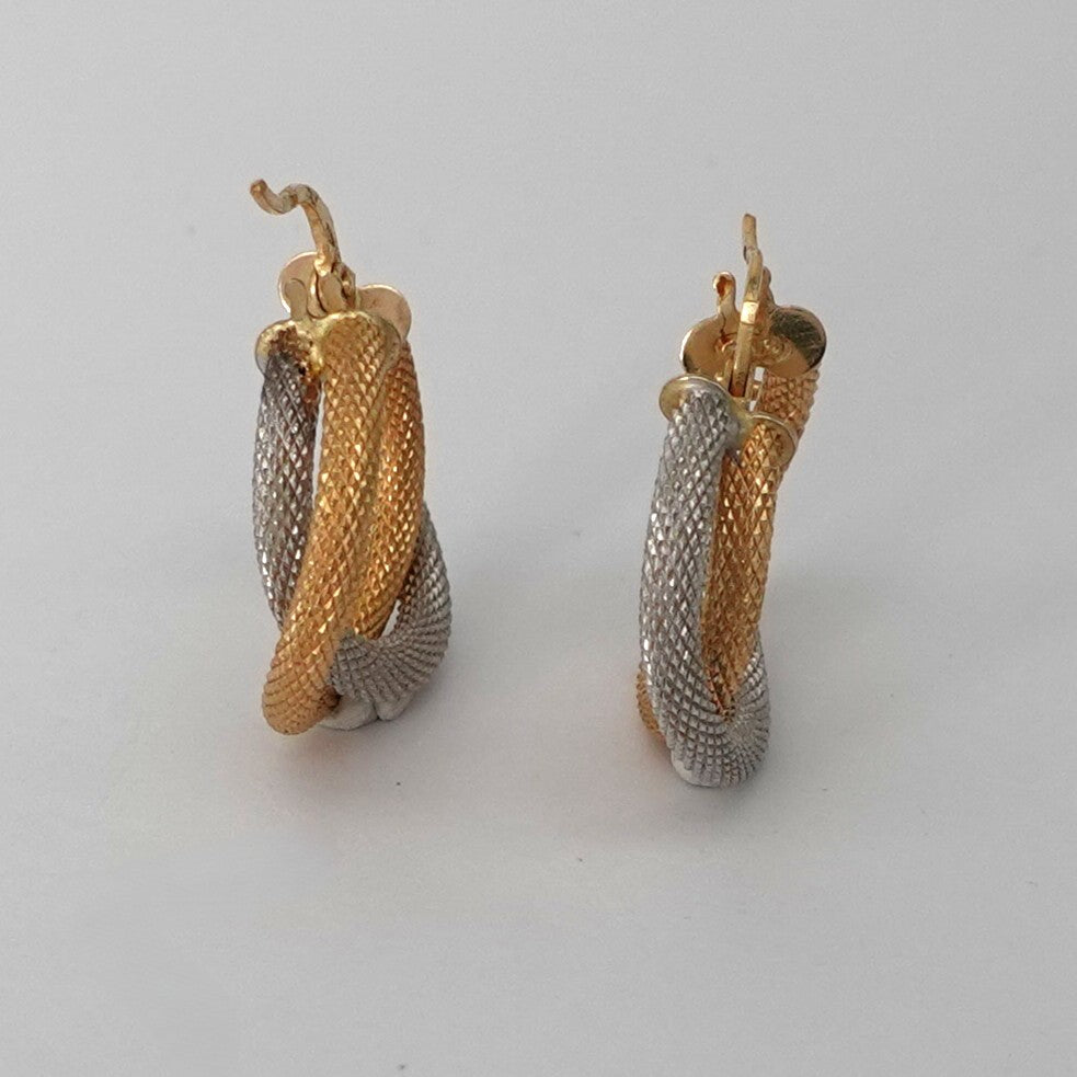 Orecchini in oro giallo e bianco 18kt, lavorazione a onda satinata.