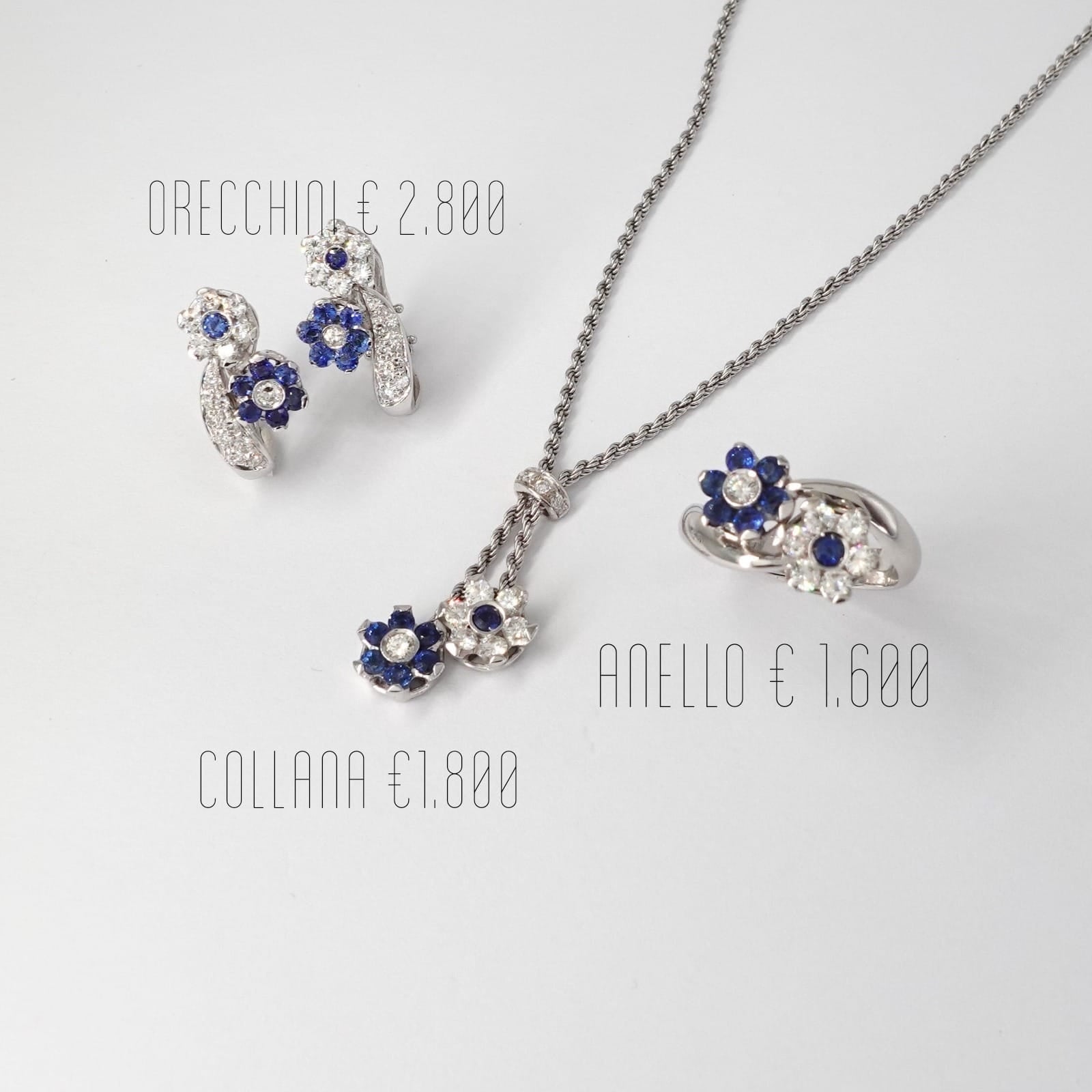 Collana: (0,16ct diamanti e 0,16ct zaffiri) Peso: 8,93gr Lunghezza: 42cm Lunghezza pendente: 2,5cm Cod.2590BAnello: (0,16ct diamanti e 0,16ct zaffiri) Peso: 5,76gr, Misura: 12 Cod.2584BOrecchini: (0,68ct diamanti e 0,32ct zaffiri) Peso: 6,94gr, Misura: 2cm Cod.2588B
